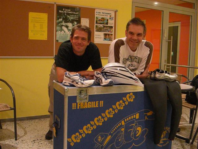 Auf dieser Kiste ist gut Lachen: Peter Dortschy und Dirk Wölk (vl) vor dem Start
