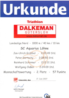 Während Peter Dortschy und Uli Grübbel die Plätze 2 und 3 auch auf der Radstrecke behaupteten, musste Reinhard Schirmer hier etwas abreißen lassen, konnte jedoch auf der Laufstrecke einiges wieder gut machen, was ihm am Ende den 14. Platz aller Landesligisten einbrachte. Peter Dortschy verlor auf der Laufstrecke leider etwas an Boden finishte dennoch respektabel als 8. Heimkehrer Uli Grübbel kämpfte sich mit der zweitbesten Laufzeit des Tages zwar immer weiter an den Führenden heran ohne ihn allerdings noch ganz einholen zu können und landete somit auf Platz 2. Das sehr zufriedenstellende Mannschaftsergebnis komplettierte Wolfgang Claßen bei seinem ersten Ligaeinsatz überhaupt und mit neuem Rad als 33., so dass am Ende mit dem 2. Platz in der Teamwertung ein weiteres Stück Vereinsgeschichte geschrieben wurde.